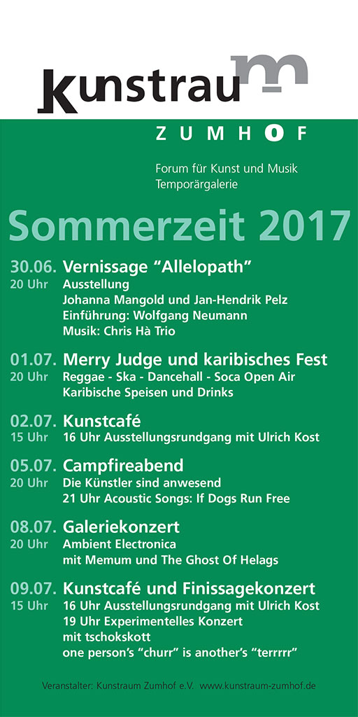 | Johanna Mangold | Jan-Hendrik Pelz ALLELOPATH 30.06 - 9.7.2017 Im Rahmen des Projekts „Allelopath" entstand eine Reihe von sich aufeinander beziehenden Werken. Den Anfang markierte eine Monotypie von Johanna Mangold, auf die Jan-Hendrik Pelz mit einer Arbeit künstlerisch reagierte. Auf diese wiederum bezog sich Mangold mit einem weiteren Werk. In einer Fortführung dieses Prinzips entstand eine Kette aus zusammenhängenden Arbeiten, wobei der Bezug zwischen den Werken sowohl inhaltliche, formale als auch assoziative Aspekte aufweisen kann. Die Serie „Allelopath“ umfasst Malerei, grafische Arbeiten, Objekte, Lyrik und Klangstücke.